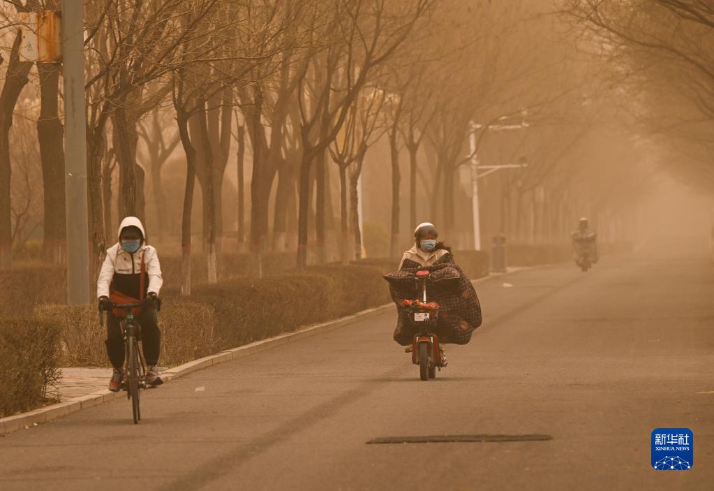 4月10日,市民在呼和浩特市街道上骑行。当日,我国北方多地出现沙尘天气。新华社记者 刘磊 摄