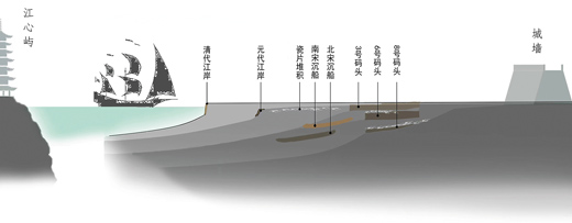考古发掘为我们还原了当时的港口形制。发掘区西、东两端分别为朔门瓮城及水门外遗迹群,中间跨度达380米的条带状区域中,密集分布着码头、沉船、杆栏式建筑、堤岸等。其中,码头遗址多为多级月台状的突堤式码头。两宋时期的突堤式码头多建于江边滩涂,平面呈长方形,石包土心结构,底部及周缘用木桩打底和围护,以抵御水流冲刷侵蚀,实现软基加固。这一先进技术,显示出古人的智慧。