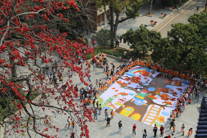 中山纪念堂350多岁的“木棉王”见证百童同绘英雄花。(受访者供图)