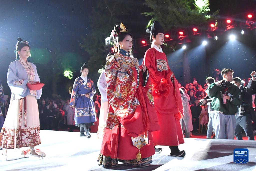 4月22日在第五届“中国华服日”山东分会场拍摄的古代婚礼服饰展示。新华社记者 徐速绘 摄