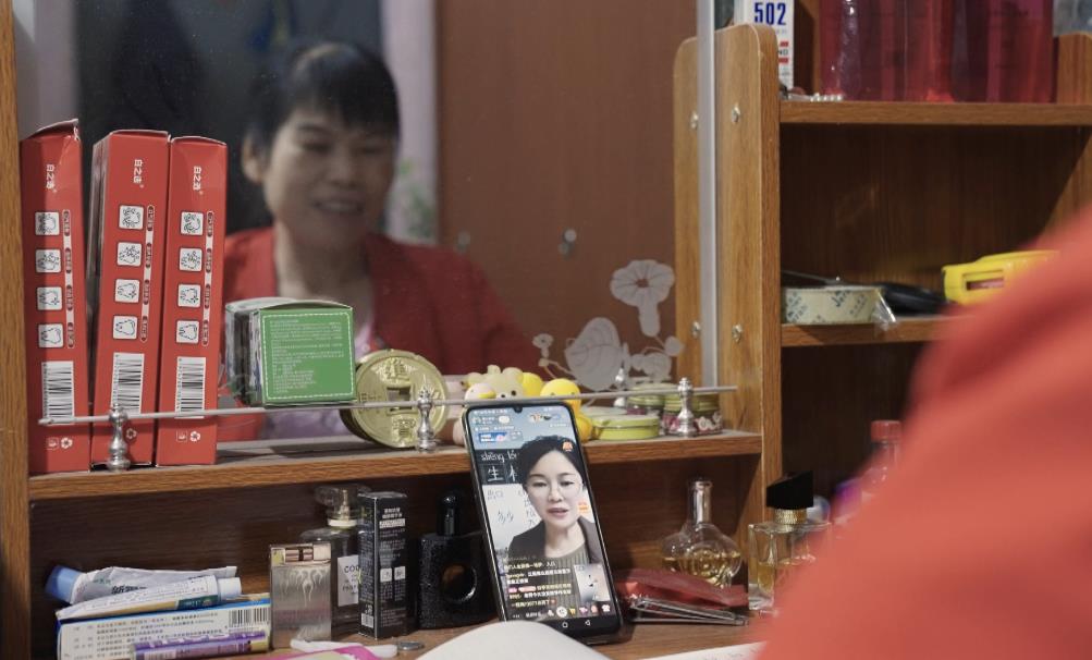 黄土娇在直播间里听金霞讲课。(受访者供图)