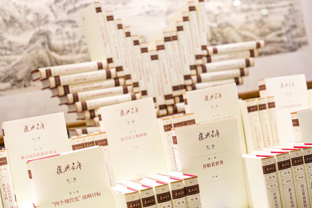 在主题展览区,一些读者在《复兴文库》的宏大“书阵”前驻足良久。这套大型历史文献丛书,揭示了中华民族走向伟大复兴的历史逻辑、思想源流和文化脉络,深深吸引着每一位读者。