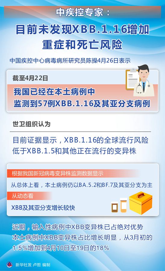 新华社北京4月26日电(记者董瑞丰、李恒)当前,我国检出了奥密克戎变异株XBB.1.16输入。中国疾控中心病毒病所研究员陈操26日在国务院联防联控机制新闻发布会上表示,截至4月22日,我国已经在本土病例中监测到57例XBB.1.16及其亚分支病例。世卫组织认为,目前证据显示,XBB.1.16的全球流行风险低于XBB.1.5和其他正在流行的变异株。