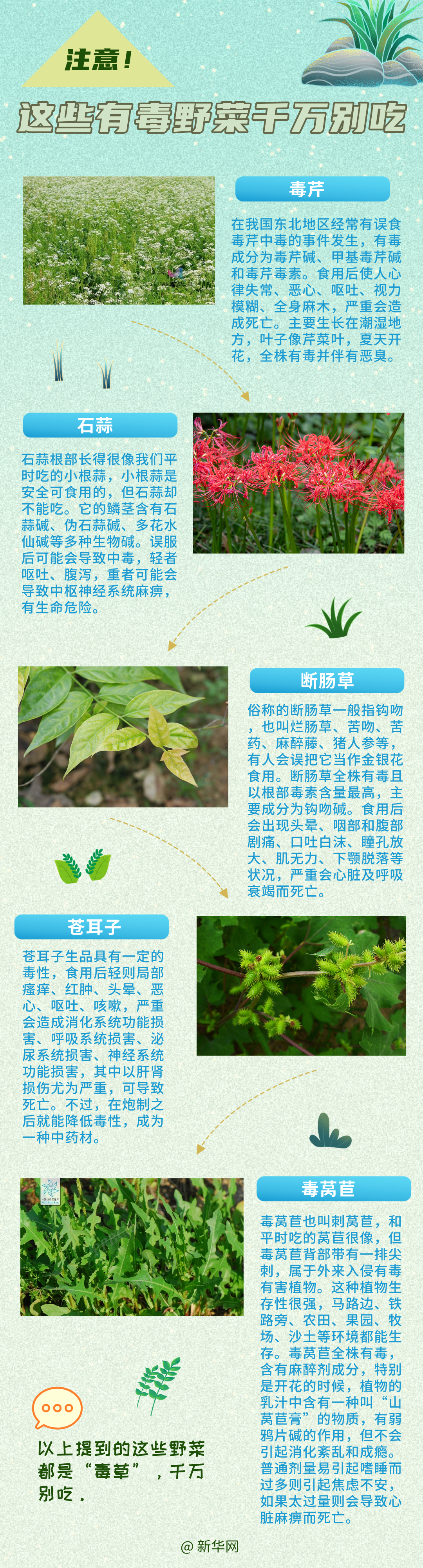 春季采食野菜一定要小心,建议公园、小区绿化带、田地里的野菜也最好别吃,谨防误食后出现食物中毒。如果实在想吃这类菜,建议到正规商超购买,吃着更放心。(综合科普中国、学习强国等媒体报道内容)