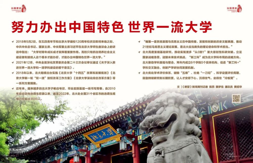 2021年12月,中央全面深化改革委员会第二十三次会议审议通过《关于深入推进世界一流大学和一流学科建设的若干意见》;2022年2月,教育部、财政部、国家发展改革委正式印发该意见,明确“选择若干高水平大学,全面赋予自主设置建设学科、评价周期等权限,鼓励探索办学新模式”,北大首批获得学科建设自主权。