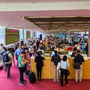 4月16日,正在广交会办证处登记的中外采购商。新华社记者魏弘毅 摄