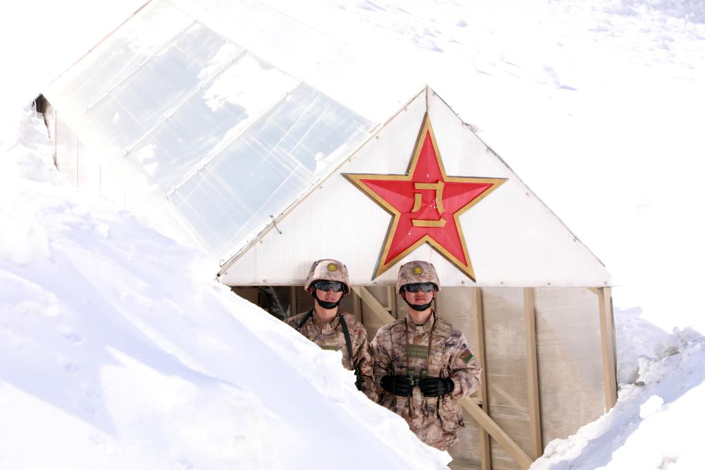 西藏军区某边防团标沙拉错哨点官兵在被大雪掩埋过半的营房门前站岗执勤(2023年4月25日摄)。叶元林 摄