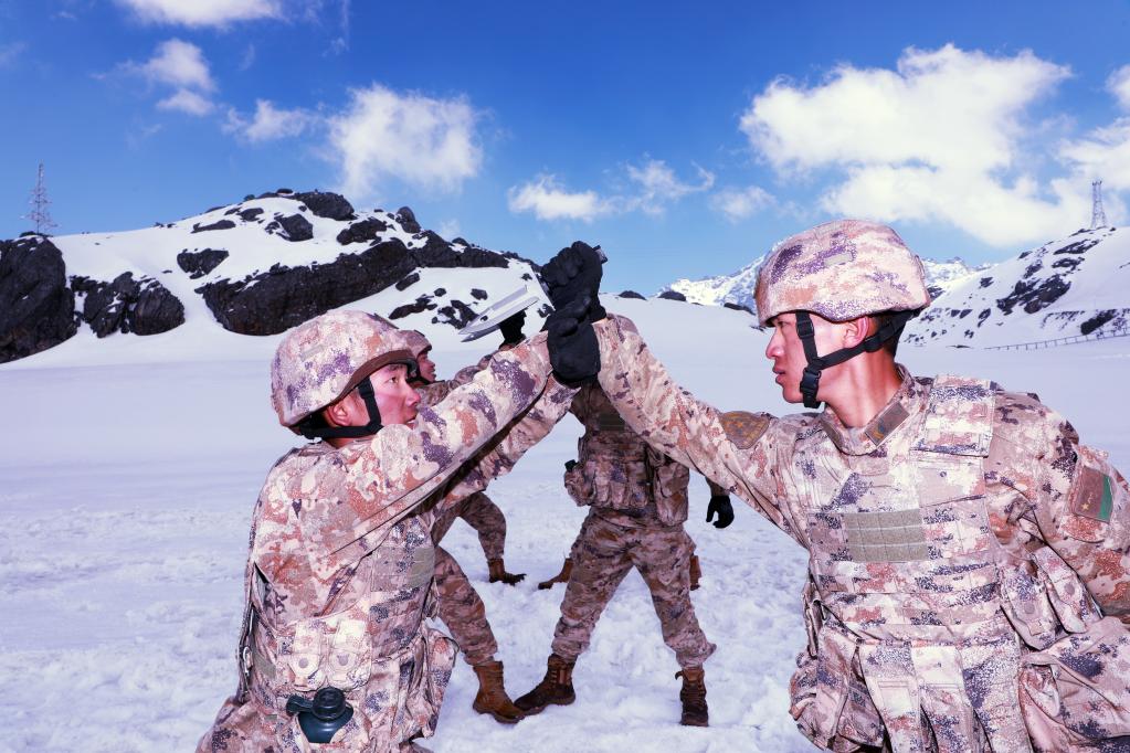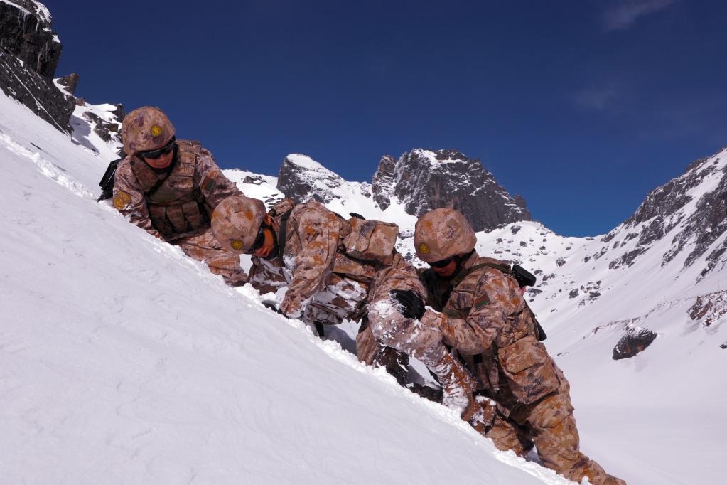 西藏军区某边防团标沙拉错哨点官兵巡逻途中互帮互助(2023年4月22日摄)。叶元林 摄