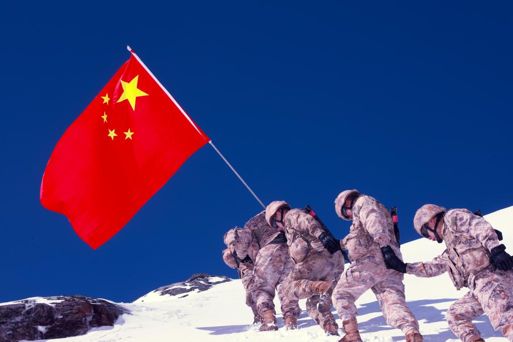 西藏军区某边防团标沙拉错哨点官兵巡逻到点位后展示国旗(2023年4月22日摄)。叶元林 摄