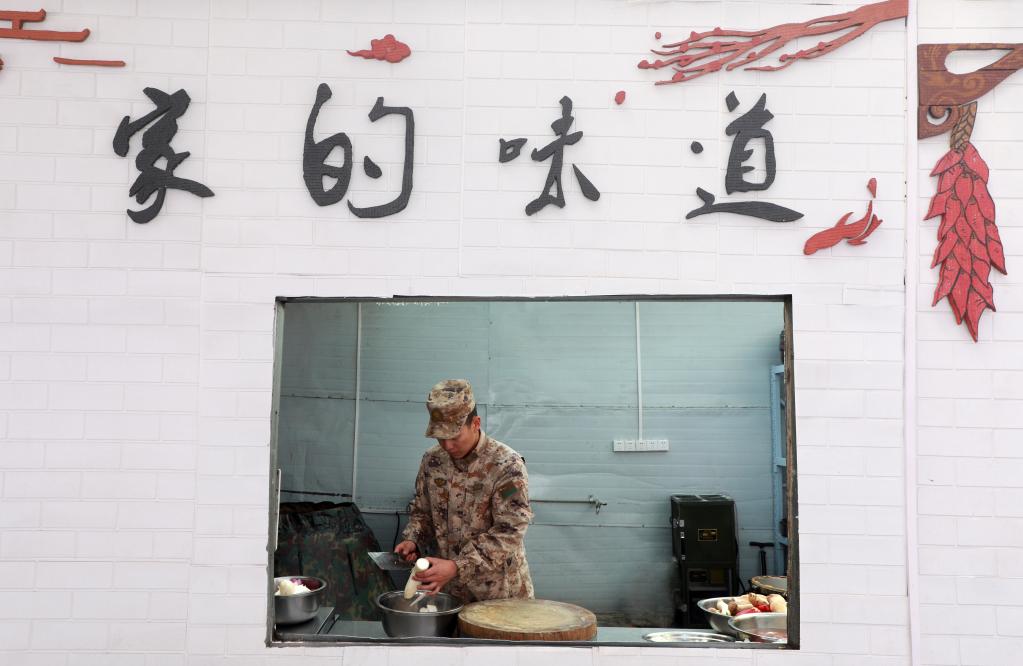 西藏军区某边防团标沙拉错哨点官兵在自建厨房准备饭菜(2023年4月25日摄)。叶元林 摄