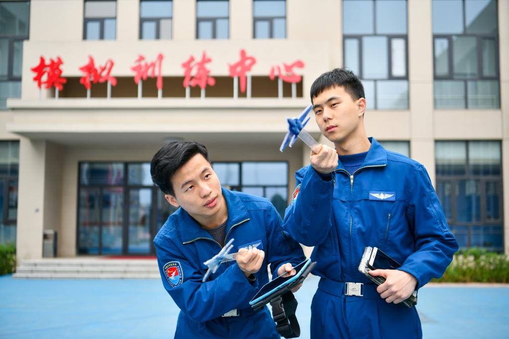 空军石家庄飞行学院某旅飞行教员与“清北班”学员进行一对一协同准备(2023年4月24日摄)。朱桦 摄