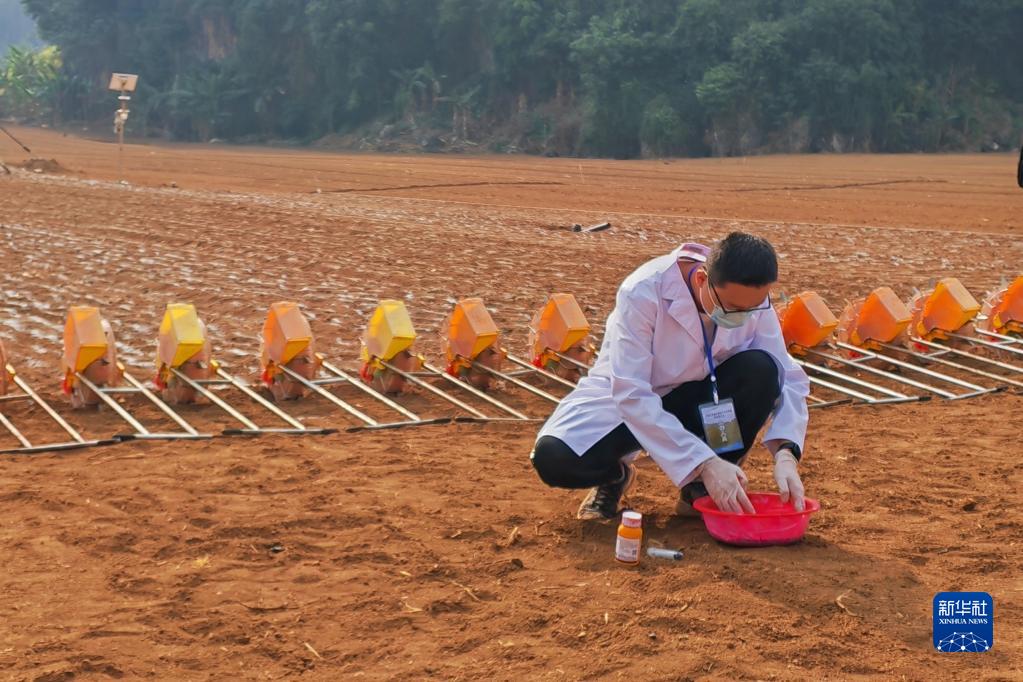4月29日,在云南省普洱市澜沧县竹塘乡,中国工程院院士朱有勇团队的技术人员演示水稻旱作拌种流程。新华社记者 杨静 摄