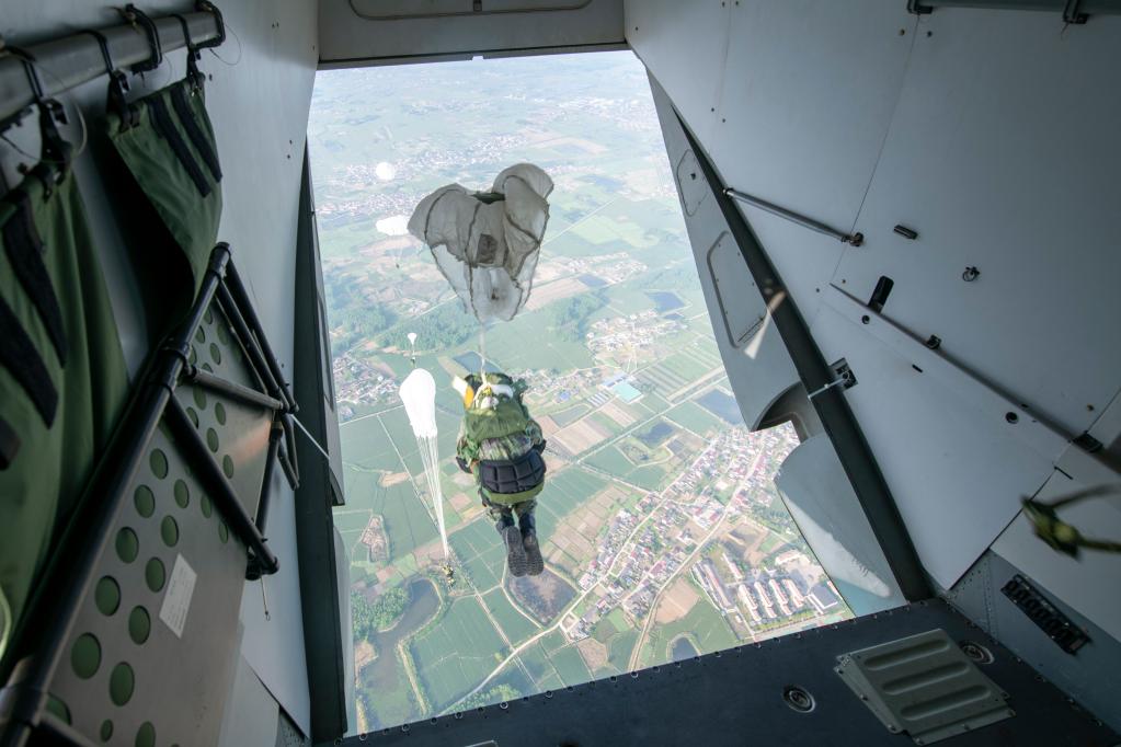 伞降实跳训练中,海军陆战队某旅女兵分队战士到达预定空域后果断离机(2023年4月20日摄)。宋紫栋 摄