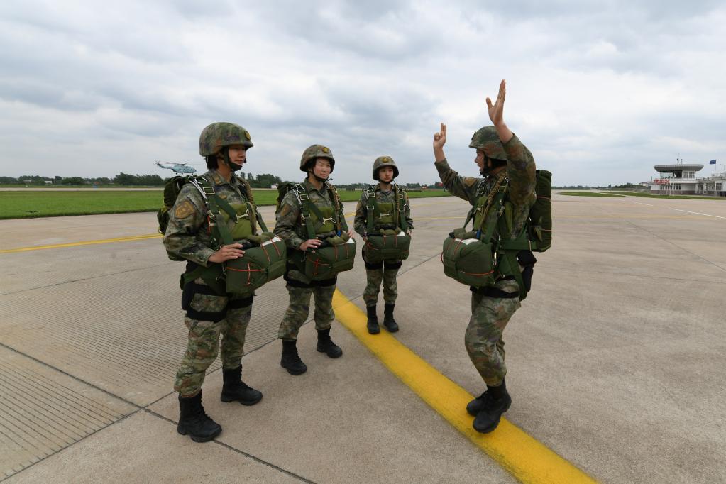 伞降实跳训练登机前,海军陆战队某旅女兵分队的老跳伞员带领新跳伞员重温动作要领(2023年4月24日摄)。宋紫栋 摄