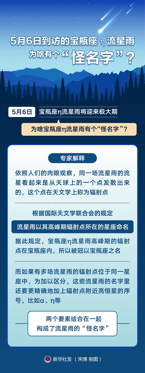 新华社南京5月5日电(记者王珏玢、邱冰清)5月6日,宝瓶座η流星雨将迎来极大期。对这场有着哈雷彗星“血统”的流星雨,很多公众心怀期待。为啥宝瓶座η流星雨有个“怪名字”?流星雨到底从哪来?天文科普专家带您从科学视角揭开流星雨的秘密。