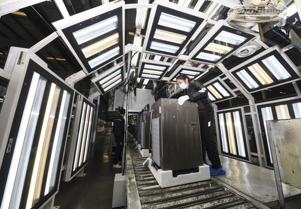 工人在重庆海尔洗衣机有限公司生产车间检测产品质量。新华社记者王全超摄