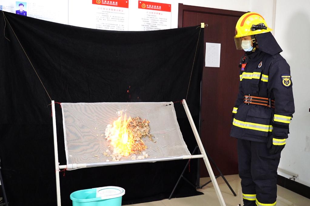 消防员在展示柳絮点燃实验。 张少欣 摄