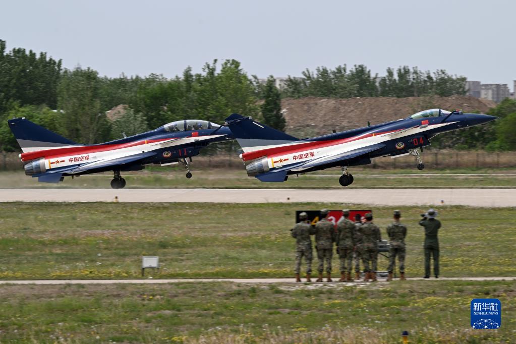 空军八一飞行表演队歼-10C(右)和歼-10S(左)表演机编队起飞,开展训练(5月6日摄)。新华社发(余红春 摄)