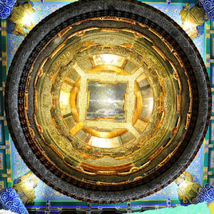 北京古代建筑博物馆的镇馆之宝是这座美轮美奂的藻井,整个藻井的结构为方井内含圆井,圆井内又含方井。藻井四角立力士雕像,意在托起中心圆井。圆井应为六层框架,现存有五层,其中几层之上布置有天上宫阙。宫阙里有精雕细琢的仙人天女,表情神态极为细腻。藻井的最上方是一幅星象图,在灯光照射下宛若星河。