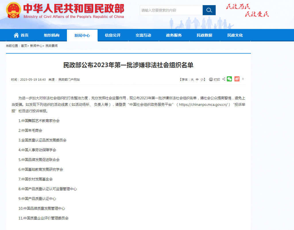 民政部5月19日公布2023年第一批涉嫌非法社会组织名单,包含中国舞蹈艺术教育家协会、中国羊毛商会、全国质量认证品质发展委员会、中国人事劳动保障学会、中国品牌发展促进联合会、中国基础教育发展研究学会、中国农村发展基金会、中国产品质量认证认可监督管理中心、中国产品质量认证中心、中国品牌质量发展管理中心、中国质量企业评价管理委员会共11家。