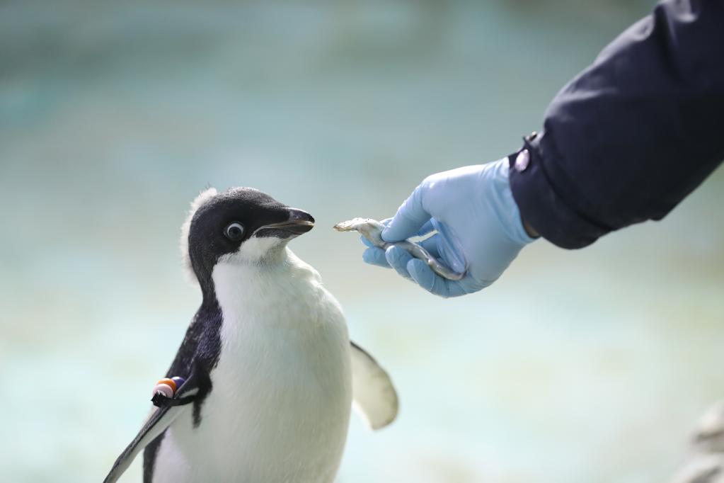 2019年12月25日,饲养员给企鹅喂食。