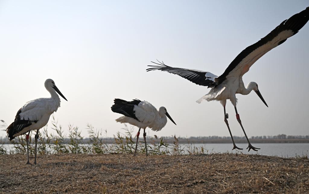 2022年11月23日,3只被救助的东方白鹳在七里海湿地重返自然。