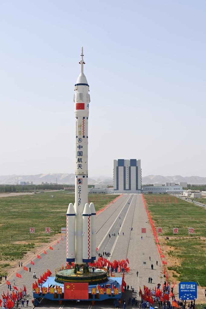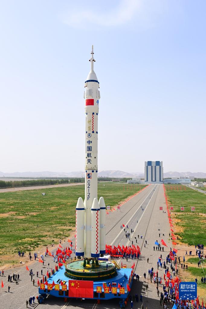 5月22日,神舟十六号载人飞船与长征二号F遥十六运载火箭组合体转运至发射塔架。新华社发(汪江波 摄)