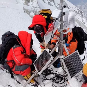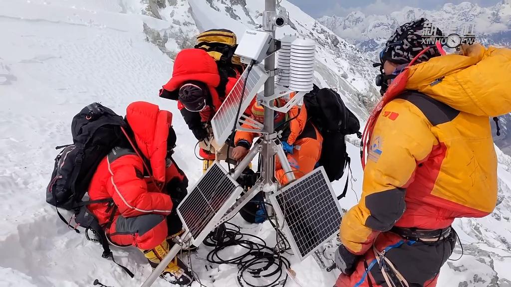 23日,科考队员抵达海拔8830米的世界海拔最高自动气象观测站。固定钢丝绳索,更换蓄电池,安装风速风向传感器……经过约1小时紧张工作,自动气象站维护升级工作全部完成。