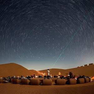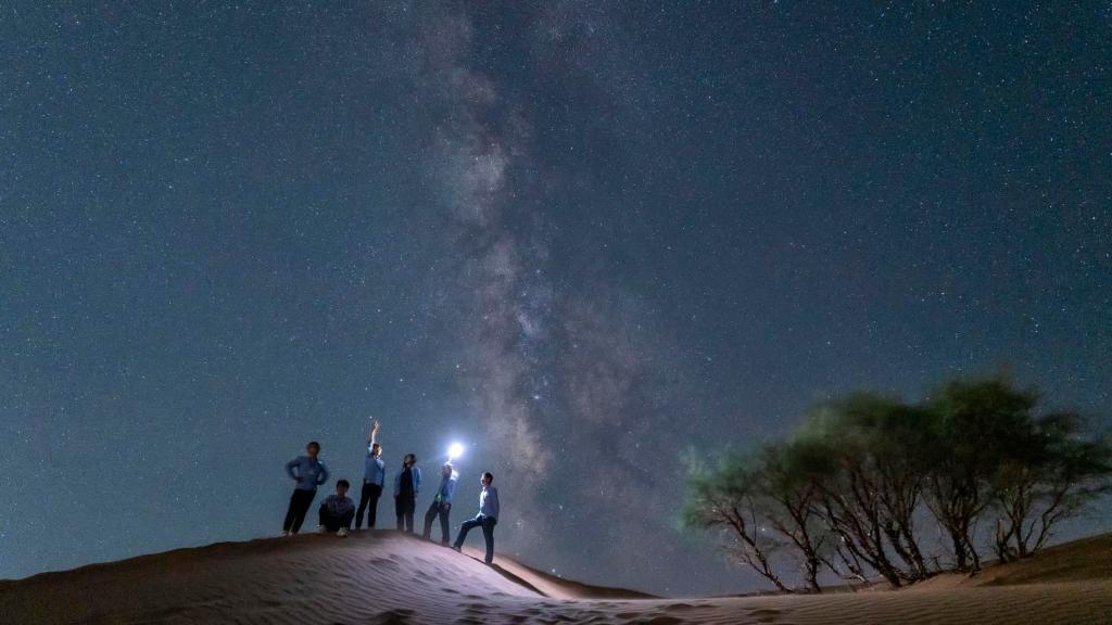 漆黑的沙漠中,“观星谷”不时传出孩童们兴奋的尖叫声。“大家看,北斗七星斗勺前部两颗星星,它们的延长线方向,就是北极星。”跟随着星空导师的绿色激光笔,游客们逐一认知星座,感受浩瀚星空。