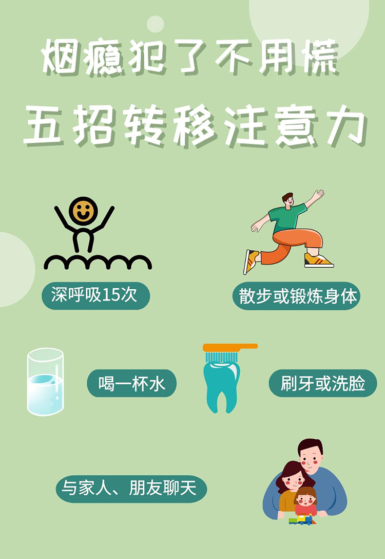 烟瘾一般仅持续几分钟,坚持一下就过去了,分散注意力是对抗烟瘾最好的方法之一。