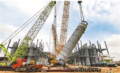 6月1日,在内蒙古鄂尔多斯润阳悦达光伏装备制造全产业链科技示范项目施工现场,工人们抢抓工期,稳步推进钢结构厂房建设和设备安装,确保项目如期建成投产。王 正摄(新华社发)
