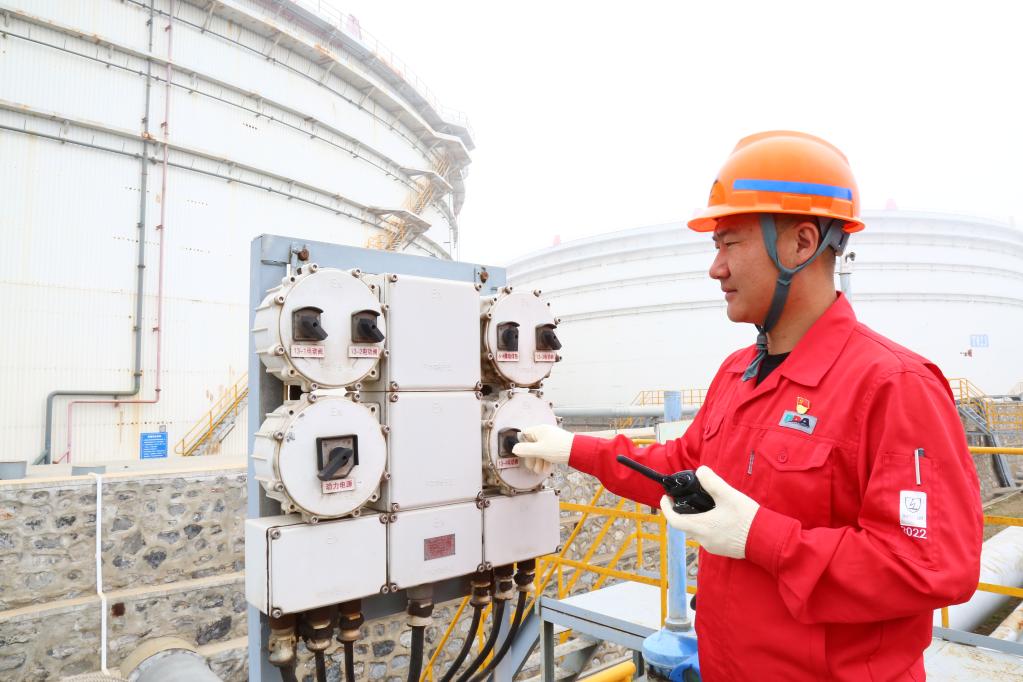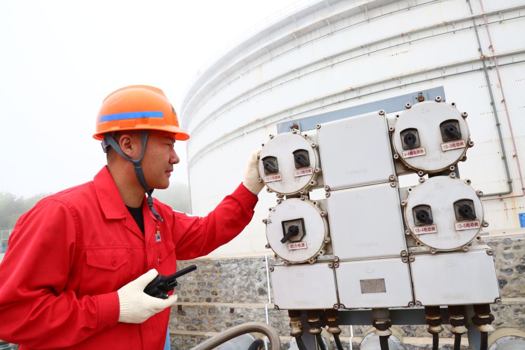 李云龙在罐区现场检查配电箱。新华社记者张博群 摄