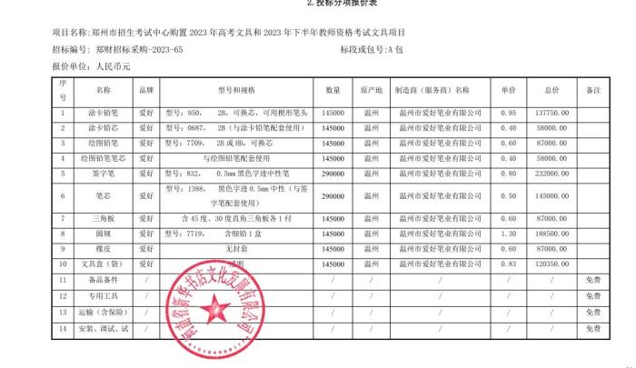 郑州市招生考试中心购置2023年高考文具和2023年下半年教师资格考试文具项目报价信息 图片来源:河南省政府采购网