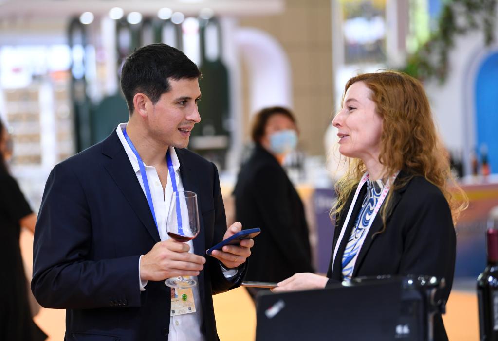 6月9日,嘉宾在展会现场品鉴葡萄酒。当日,国际葡萄与葡萄酒产业大会、第三届中国(宁夏)国际葡萄酒文化旅游博览会在宁夏银川开幕。新华社记者冯开华摄