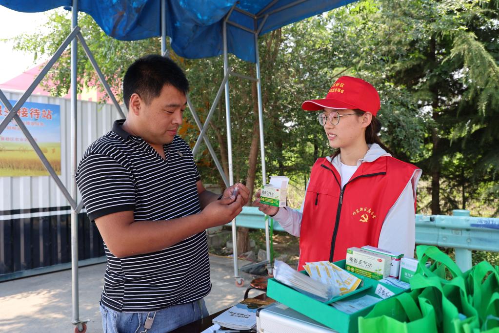在G4京港澳高速邢台北口,跨区机收接待服务站工作人员向农机手发放防暑物品。新华社记者 邹尚伯 摄