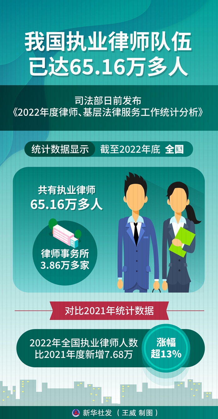 新华社北京6月14日电(记者白阳)司法部日前发布《2022年度律师、基层法律服务工作统计分析》。统计数据显示,截至2022年底,全国共有执业律师65.16万多人,律师事务所3.86万多家。
