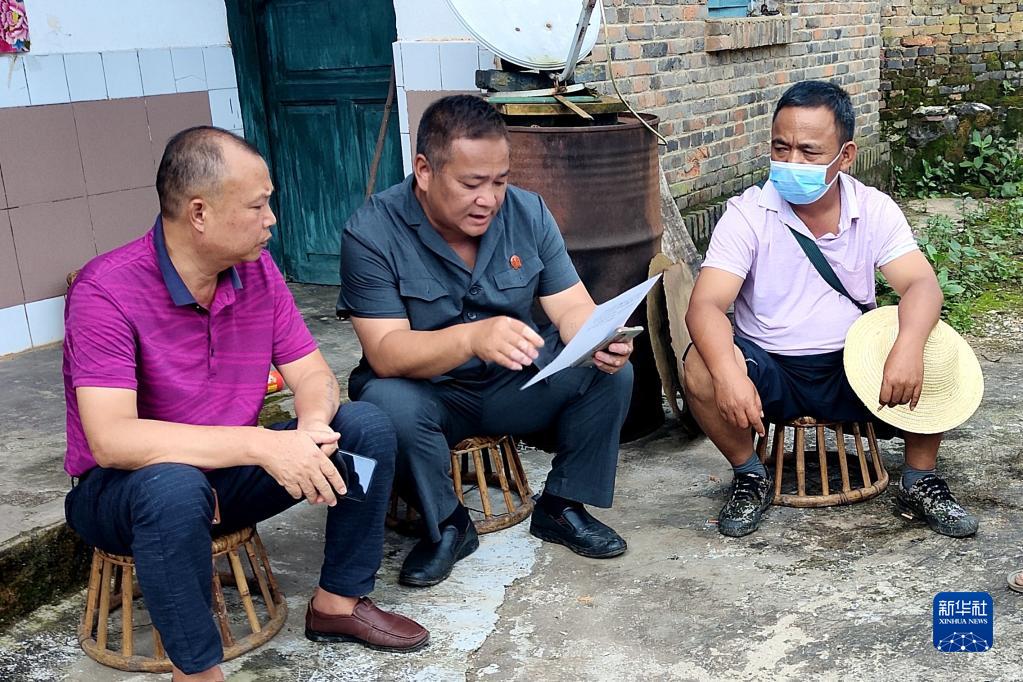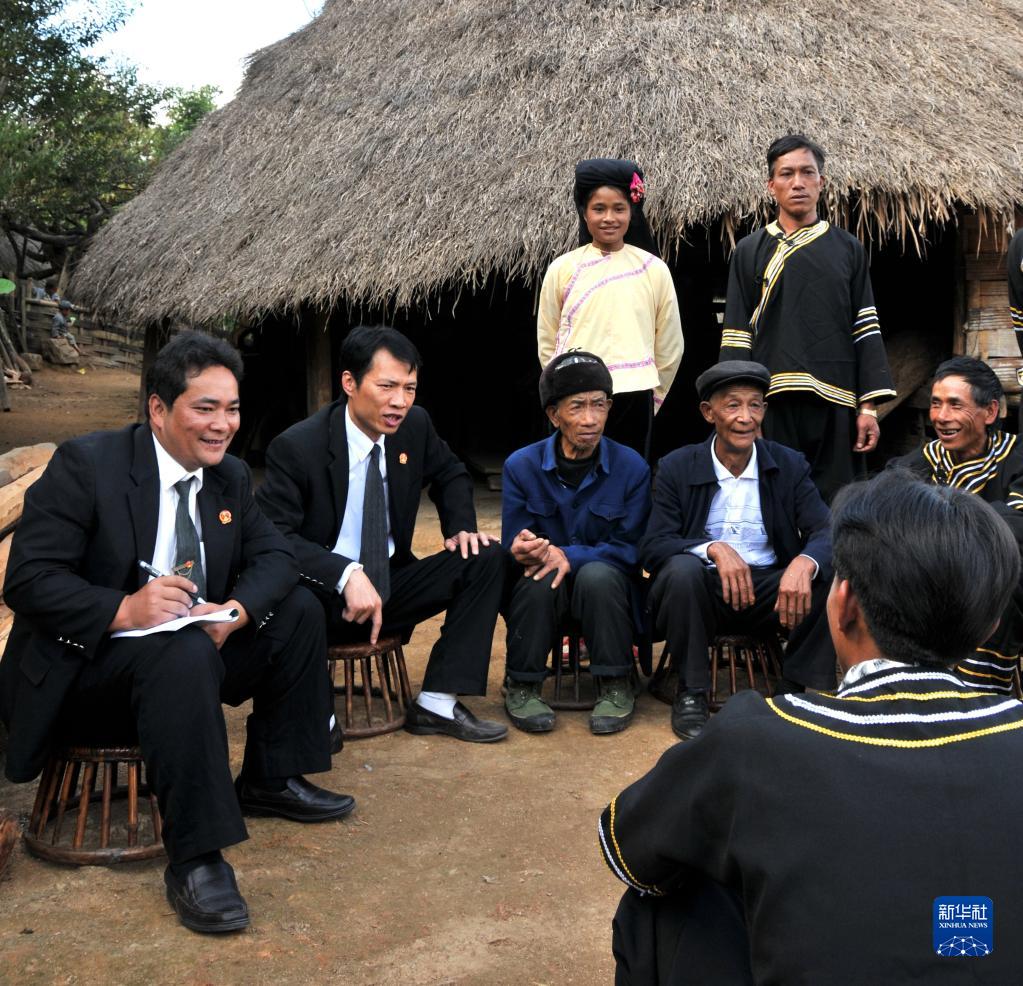 鲍卫忠(左一)在云南省沧源佤族自治县勐角傣族彝族拉祜族乡控角村委会小坝卡自然村巡回办案(资料照片)。新华社发