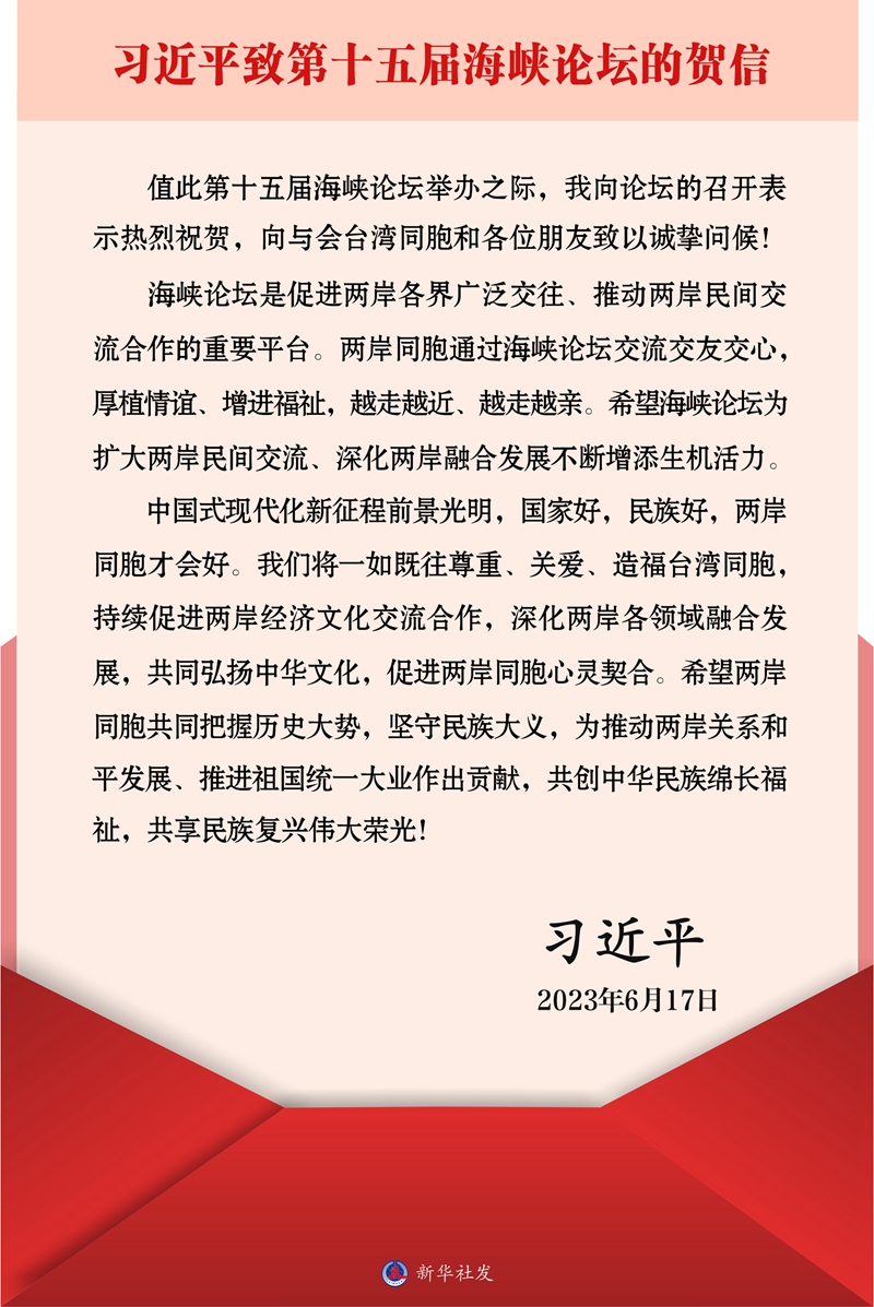 海峡论坛是促进两岸各界广泛交往、推动两岸民间交流合作的重要平台。两岸同胞通过海峡论坛交流交友交心,厚植情谊、增进福祉,越走越近、越走越亲。希望海峡论坛为扩大两岸民间交流、深化两岸融合发展不断增添生机活力。