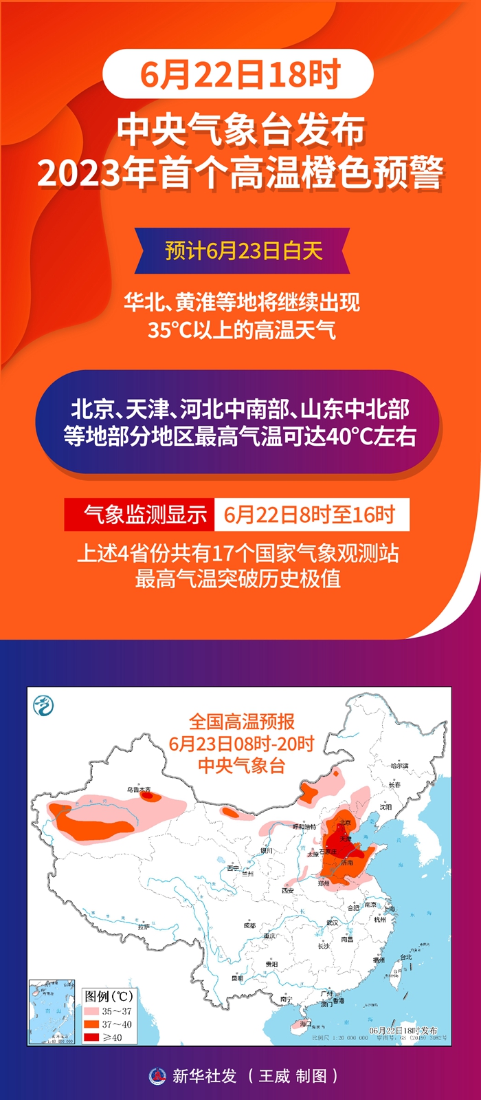 新华社北京6月22日电(记者黄垚)22日18时,中央气象台升级发布今年首个高温橙色预警。预计23日白天,华北、黄淮等地将继续出现35℃以上的高温天气,北京、天津、河北中南部、山东中北部等地部分地区最高气温可达40℃左右。