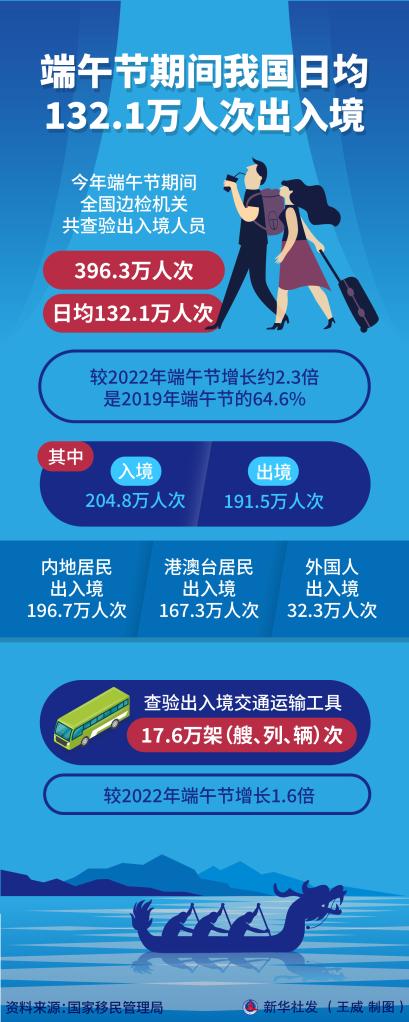 新华社北京6月25日电(记者任沁沁)记者25日从国家移民管理局获悉,今年端午节期间全国边检机关共查验出入境人员396.3万人次,日均132.1万人次,较去年端午节增长约2.3倍,是2019年端午节的64.6%。其中,入境204.8万人次,出境191.5万人次;内地居民出入境196.7万人次,港澳台居民167.3万人次,外国人32.3万人次。查验出入境交通运输工具17.6万架(艘、列、辆)次,较去年端午节增长1.6倍。