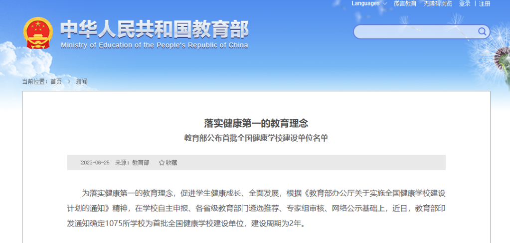 记者6月25日从教育部获悉,为落实健康第一的教育理念,促进学生健康成长、全面发展,在学校自主申报、各省级教育部门遴选推荐、专家组审核、网络公示基础上,教育部近日印发通知,确定1075所学校为首批全国健康学校建设单位,建设周期为2年。