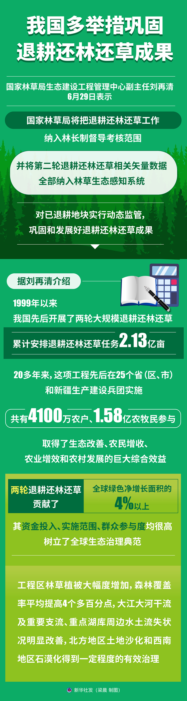 他说,两轮退耕还林还草贡献了全球绿色净增长面积的4%以上,其资金投入、实施范围、群众参与度均很高,树立了全球生态治理典范。工程区林草植被大幅度增加,森林覆盖率平均提高4个多百分点,大江大河干流及重要支流、重点湖库周边水土流失状况明显改善,北方地区土地沙化和西南地区石漠化得到一定程度的有效治理。