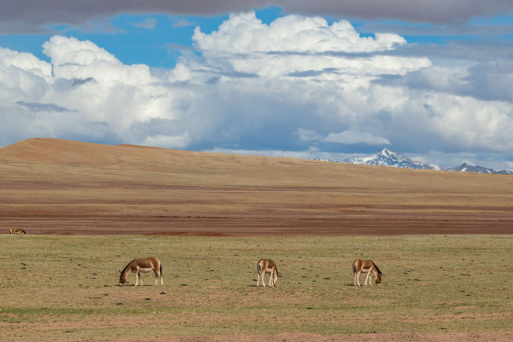 6月15日,在长江源地区的楚玛尔河附近,几只藏野驴在觅食。