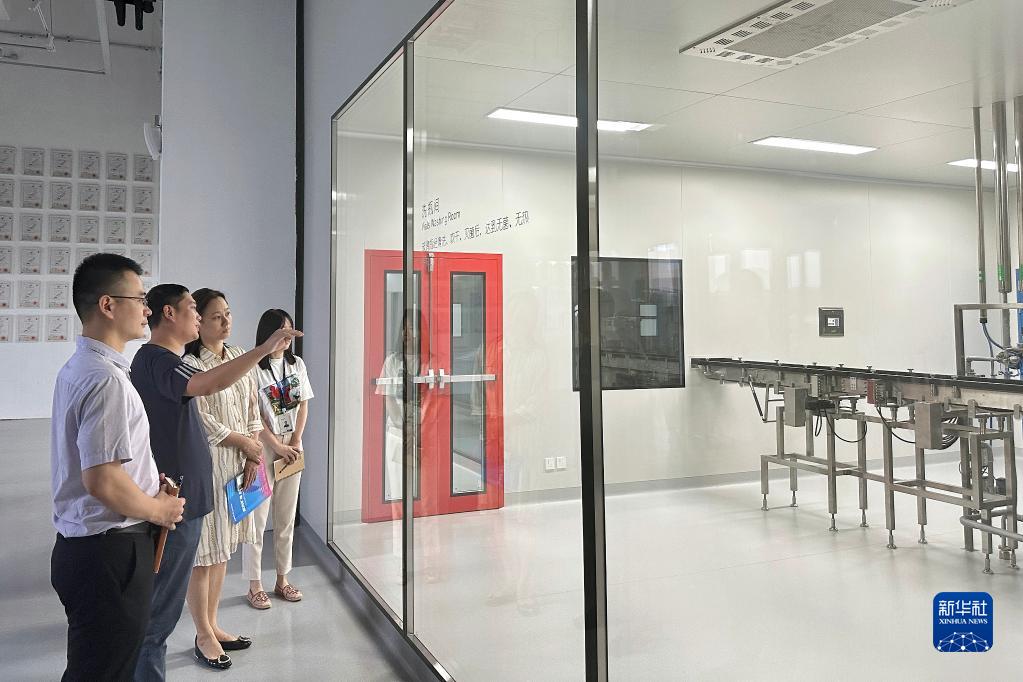 海南省商务厅外商投资管理处党员干部在海口华熙厚源生物科技(海南)有限公司调研(6月19日摄)。新华社发