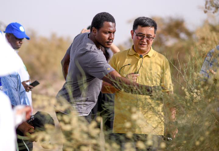2023年6月13日,在中科院新疆生态与地理研究所策勒沙漠研究站天然实验区,中国科研人员买尔当(右一)为参加第二届非洲绿色长城建设技术培训班的学员讲解。新华社记者 王菲 摄