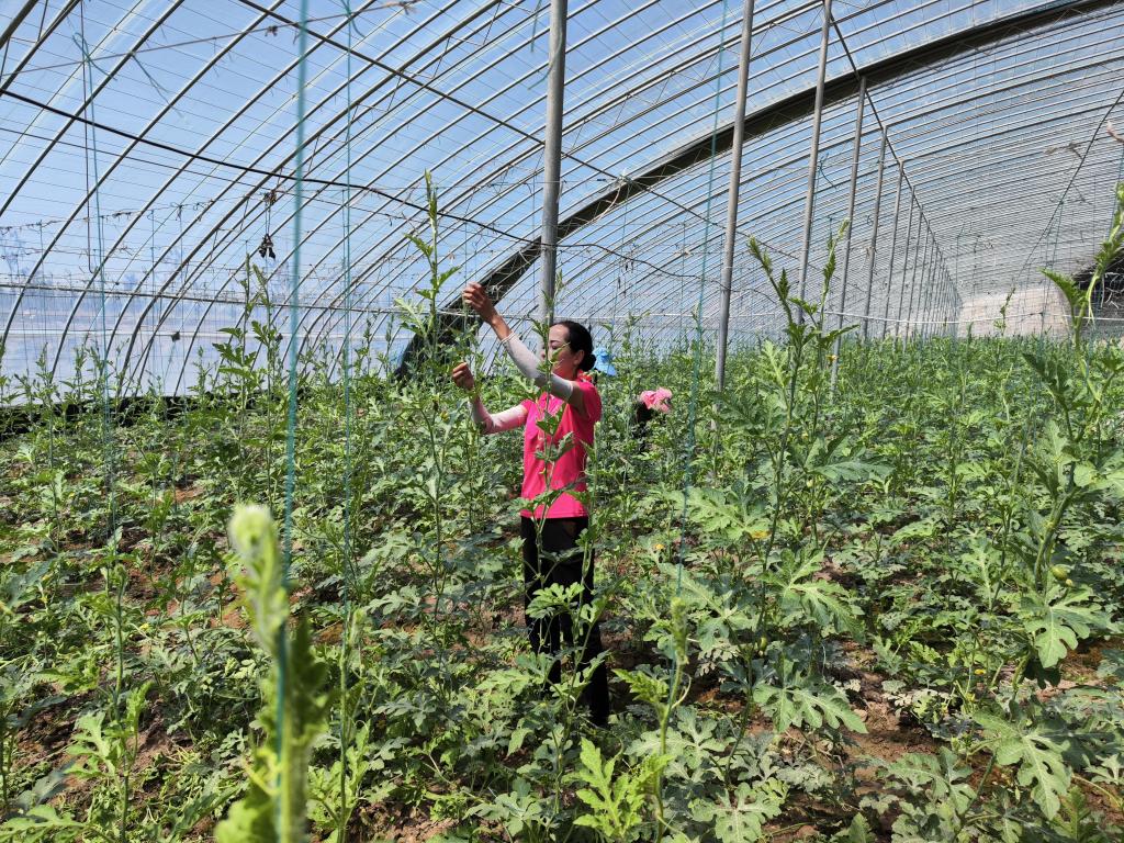在新疆疏勒县郭牌西瓜种植培训基地,农户在大棚里检查作物长势。新华社记者赵晨捷 摄