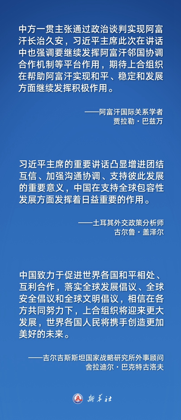 国际社会普遍认为,习近平主席的重要讲话将促进上合组织成员国增进团结互信、维护地区和平、聚焦务实合作、加强交流互鉴、完善全球治理,推动上合组织不断发展壮大,为维护世界和平与发展注入更多确定性和正能量。