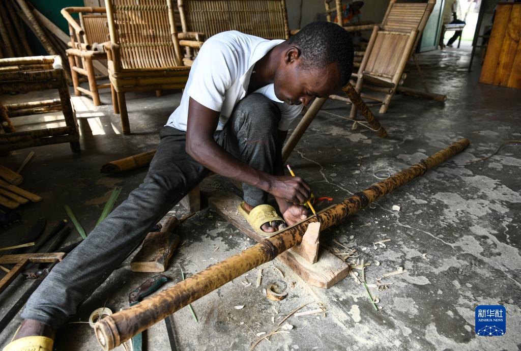 6月21日,在位于布隆迪经济首都布琼布拉的卡蒙盖手工业培训中心,学员在生产车间制作竹家具。新华社记者 韩旭 摄