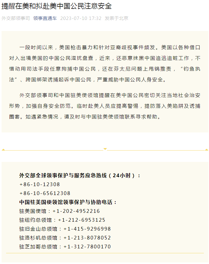7月10日,外交部“领事直通车”微信公众号发布消息,提醒在美国和拟赴美国中国公民注意安全。