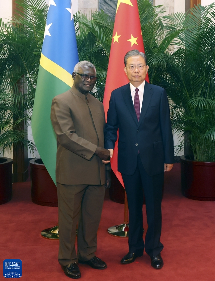 7月11日,全国人大常委会委员长赵乐际在北京会见所罗门群岛总理索加瓦雷。新华社记者 刘卫兵 摄